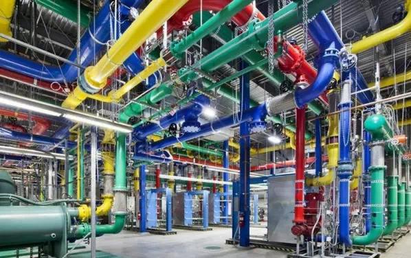 谷歌俄勒岡數(shù)據(jù)中心的這些彩色管道負責輸送水。藍色管道裝冷水,紅色管道裝熱水。