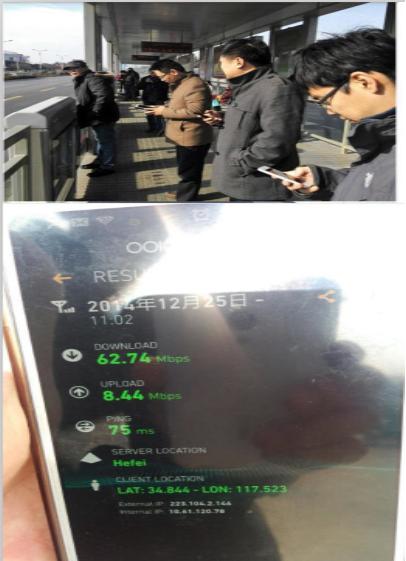 中午,記者在位于棗莊市區(qū)客流量最大的BRT換乘樞紐進(jìn)行4G業(yè)務(wù)體驗(yàn)。時(shí)值中午下班高峰,大量乘客同時(shí)移動(dòng)上網(wǎng),在此情況下實(shí)測(cè)網(wǎng)絡(luò)下行速度超過62M,體現(xiàn)出了4G超高的帶寬承載量!