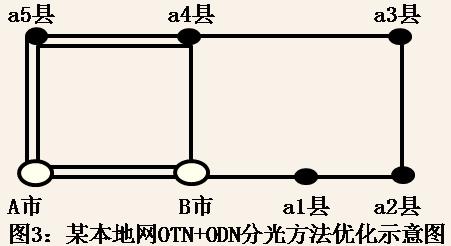 某本地網(wǎng)如圖3,A市向東穿過B市(另一個本地網(wǎng))分別向北連接a4縣、向東連接a1縣,形成小東北環(huán)、大東北環(huán)兩個環(huán),以前是在A市、B市、a4縣、a5縣各使用兩套OADM設(shè)備、占用兩對光纖。