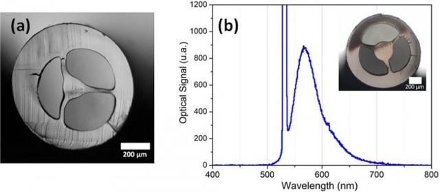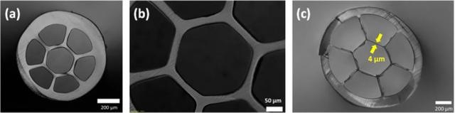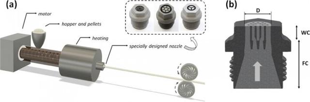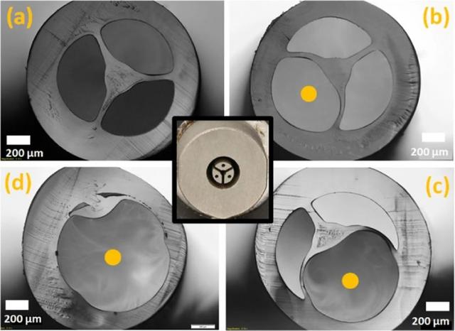 而 Cordeiro 教授開發(fā)了一種替代系統(tǒng),能夠在和微波爐差不多的設(shè)備上對原料進(jìn)行拉絲。在Cordeiro的設(shè)置中,透明的熱塑性聚合物顆粒被送入該設(shè)備,隨后該設(shè)備將其熔化,并通過一個定制的鈦噴嘴將熔融的材料擠出。根據(jù)該噴嘴的配置方式,被擠出的細(xì)光纖可以是實心的,也可以有多條空氣通道縱向穿過其內(nèi)部--后者被稱為微結(jié)構(gòu)光纖,或MOF。
