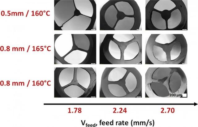 擠出后,光纖被拉過相鄰的一組輥子。這樣,在冷卻和設(shè)置時,光纖就會被拉緊,這樣,光纖內(nèi)部的任何通道就不會自行塌陷。據(jù)稱,整個過程不僅比傳統(tǒng)技術(shù)更快、成本更低、結(jié)構(gòu)更緊湊,而且纖維的長度只受限于可送入擠出機的顆粒數(shù)量。