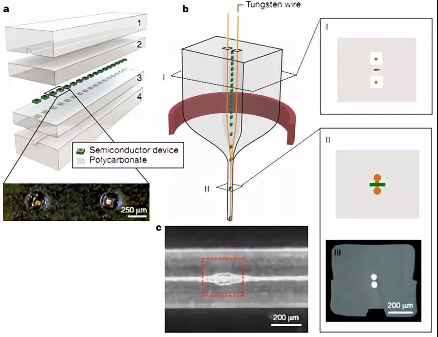 半導(dǎo)體二極管是現(xiàn)代計(jì)算、通信和傳感技術(shù)的基本組成部分。因此,將它們整合到紡織品級的纖維中,可以提高織物的“聰明度”,例如,以織物為基礎(chǔ)的通信或生理監(jiān)測系統(tǒng)。目前已經(jīng)證明,在纖維預(yù)成型時,通過纖維拉伸工藝將具有不同電子和光學(xué)性質(zhì)的材料融合到單絲中,可以增加纖維和織物的功能性。然而,該方法僅限于可以在其粘性狀態(tài)下共同拉伸的材料,并且其性能比不上使用基于晶圓制備方法得到的“器件級”材料。到目前為止,在熱拉伸纖維中實(shí)現(xiàn)高質(zhì)量半導(dǎo)體二極管還存在一些加工技術(shù)的挑戰(zhàn)。
