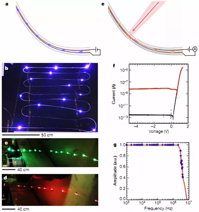 d、包含InGaN LEDs 的發(fā)光纖維發(fā)出紅色;