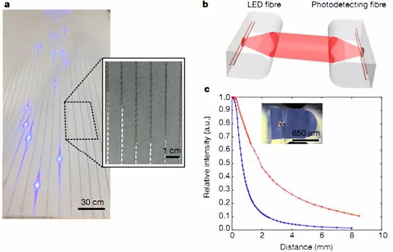 a、嵌入織物中的發(fā)光和光檢測纖維。