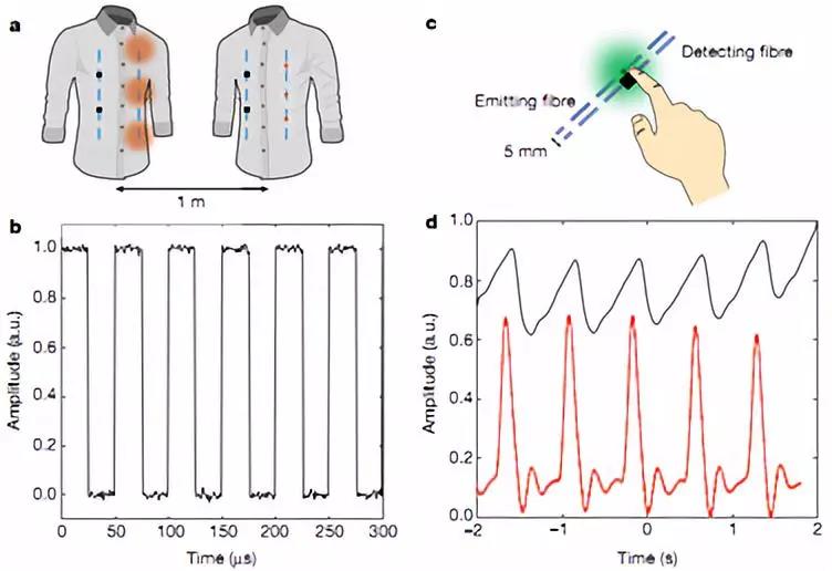 為了證明這種纖維的光通信性能,他們在兩種含有接收/發(fā)射極纖維的織物之間,建立了一個3MHz雙向光通信鏈路。同時,利用二極管的光電容積脈搏波脈沖測量方法(photoplethysmography pulse measurement),該智能織物能夠?qū)崟r檢測人體的生理狀態(tài),比如心率、呼吸或者脈搏等。