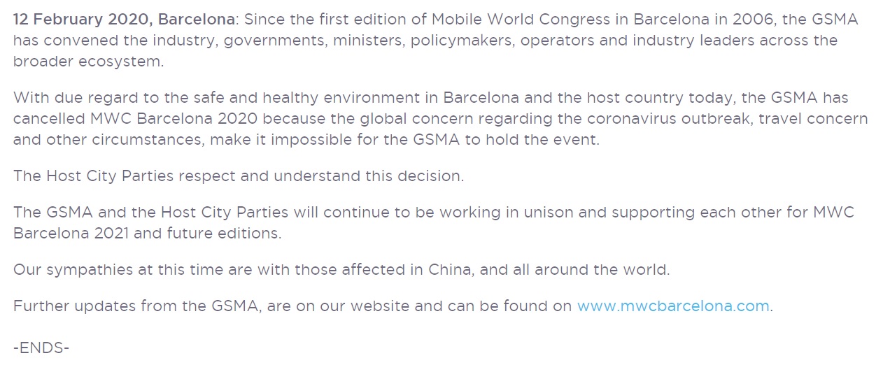 ICCSZ訊 因?yàn)樾鹿诜窝滓咔橛绊?,世界移?dòng)通信大會(huì)(MWC)在周三宣布取消。主辦方GSMA電信協(xié)會(huì)表示,盡管當(dāng)?shù)睾蛧?guó)家衛(wèi)生官員保證舉辦活動(dòng)是安全的,它還是取消了2月24日到27日的活動(dòng)。