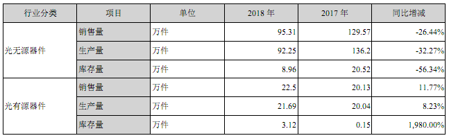 器件產(chǎn)銷方面,2018年,光無源器件總生產(chǎn)92.25萬件,同比下降32.27%,總銷售95.31萬件,同比下降26.44%;光有源器件總生產(chǎn)24.69萬件,同比增長8.23%,總銷售22.5萬件,同比增長11.77%。