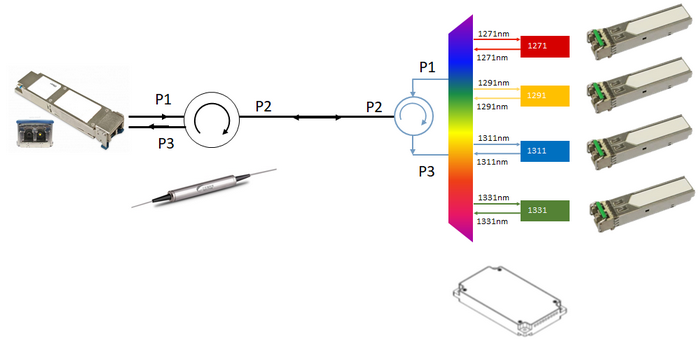 基于上述情況,三石園科技推出采用成熟的QSFP28 CWDM4-10+環(huán)形器的方式來實現(xiàn)傳統(tǒng)方案。