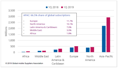 分區(qū)域來看,亞太市場LTE用戶超過29億,在全球中的占比達到66.5%,相比去年同期新增近5億。其次是歐洲,LTE用戶達到5億。北美市場LTE用戶約4.5億。