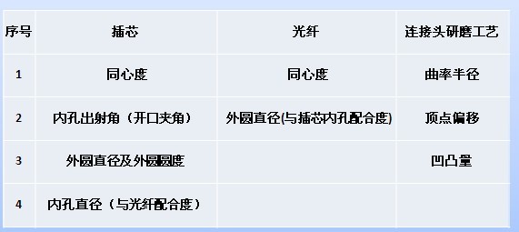 因此,由于批量測(cè)試方法和實(shí)際使用不相同,同時(shí)對(duì)于批量測(cè)試,既沒矛也沒盾的現(xiàn)實(shí),造成產(chǎn)品的質(zhì)量并不受控。IEC標(biāo)準(zhǔn)就較為直接貼近使用實(shí)際,規(guī)定了隨機(jī)對(duì)接的損耗值。同時(shí),IEC還對(duì)插芯作了直接要求。我們參考IEC標(biāo)準(zhǔn),并結(jié)合實(shí)際制作工藝,可以把影響連接器性能的因素總結(jié)如下表: