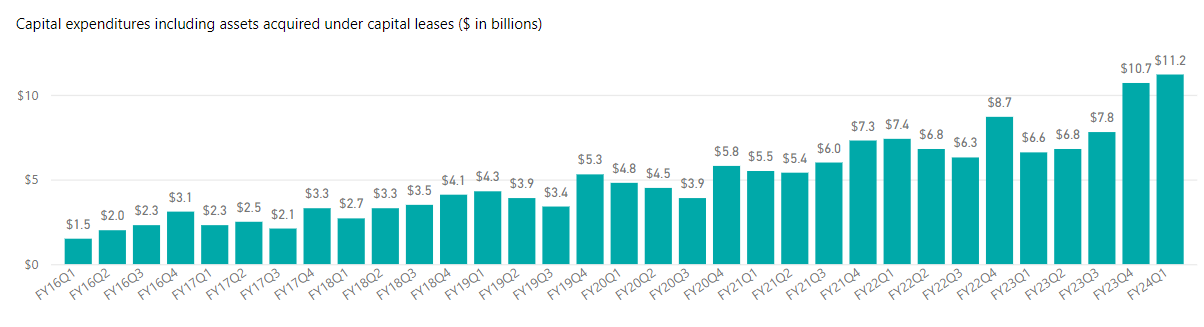 微軟2016財年以來資本支出總覽。來源:微軟財報