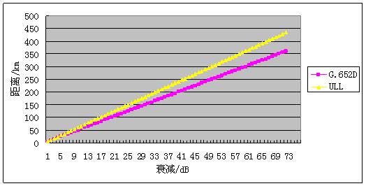 圖1相同衰耗下,普通G.652光纖與ULL光纖傳輸距離的對比