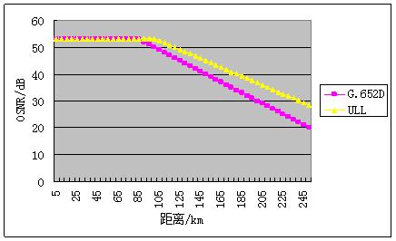 從圖1可以看出,在光纖衰減一定的情況下,ULL光纖可以比普通G.652光纖傳輸更遠的傳輸距離,而且隨著衰減值的增加,ULL光纖比G.652光纖傳輸距離的增加效果更明顯,因此對于超長站距,ULL光纖更能體現(xiàn)其價值。