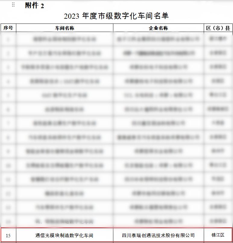 經(jīng)企業(yè)自主申報(bào)、區(qū)(市)縣工業(yè)和信息化主管部門推薦、專家評審、網(wǎng)上公示等程序,四川泰瑞創(chuàng)通訊技術(shù)股份有限公司被成都市經(jīng)濟(jì)和信息化局評為“通信光模塊制造數(shù)字化車間”,標(biāo)志著公司在智能制造和數(shù)字化轉(zhuǎn)型方面取得了突破性成果。