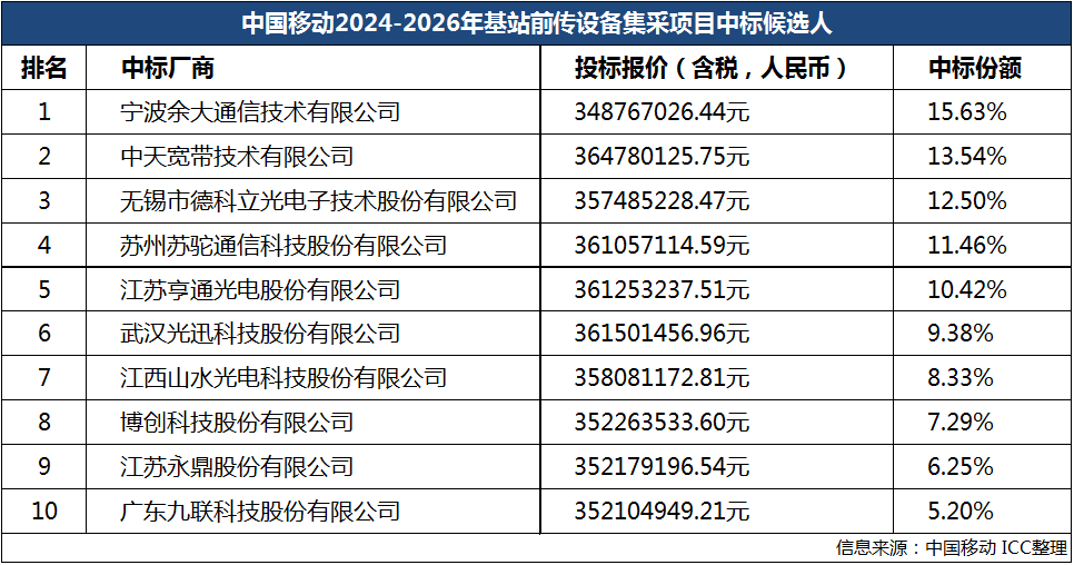 ICC訊 中國移動公布2024年至2026年基站前傳設備集中采購項目中標候選人,余大通信、中天寬帶、無錫德科立、蘇駝通信、亨通光電、光迅科技、山水光電、博創(chuàng)科技、永鼎股份、九聯(lián)科技等10家廠商入選,中標排名、報價和份額分配如下。