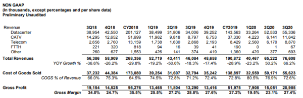 ICC訊(編譯:Nina)美國德州Sugar Land,2020年11月5日--Applied Optoelectronics公司(簡稱AOI)(納斯達(dá)克:AAOI),一家為互聯(lián)網(wǎng)數(shù)據(jù)中心、Cable寬帶、電信和FTTH市場提供光學(xué)接入網(wǎng)絡(luò)產(chǎn)品的領(lǐng)先供應(yīng)商,今天公布了其截至2020年9月30日的第三季度財報。