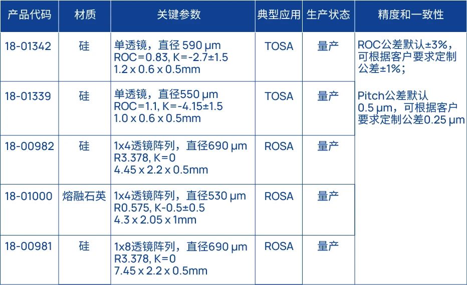 ICC訊 2024年11月21日,炬光科技發(fā)布了適用于光通信的多款標(biāo)準(zhǔn)化硅材質(zhì)、熔融石英材質(zhì)透鏡與透鏡陣列產(chǎn)品。這些產(chǎn)品具有高精度、高一致性的優(yōu)點(diǎn),符合新一代光通信領(lǐng)域Transceiver應(yīng)用或單獨(dú)TOSA/ROSA場景中的聚焦、光纖陣列準(zhǔn)直、耦合等功能需求,在擁有高性價(jià)比的同時(shí),實(shí)現(xiàn)優(yōu)秀、穩(wěn)定的耦合效率和準(zhǔn)直效果,滿足高速率光模塊對光學(xué)器件的嚴(yán)苛要求。公司同時(shí)可為客戶提供模擬仿真服務(wù),并且基于仿真結(jié)果優(yōu)化產(chǎn)品設(shè)計(jì),達(dá)到更好的光學(xué)性能。