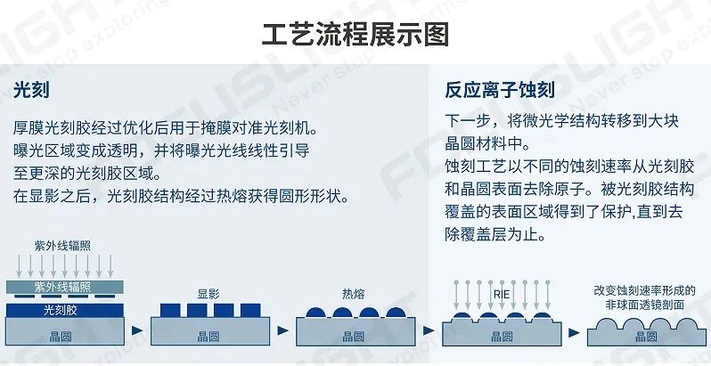 炬光科技采用光刻-反應(yīng)離子蝕刻法晶圓級(jí)微納光學(xué)精密加工制造這一核心技術(shù)實(shí)現(xiàn)硅材質(zhì)、熔融石英材質(zhì)微納光學(xué)元器件的大批量生產(chǎn)制造,為光通信行業(yè)提供多種透鏡類型、形狀、排布及陣列數(shù)量的標(biāo)準(zhǔn)化產(chǎn)品及定制服務(wù),例如非球單透鏡(可帶V槽)、N×N大透鏡陣列、1×N非球透鏡陣列、集成透鏡棱鏡和衍射光學(xué)元件(DOE)等,可靈活滿足多樣化應(yīng)用需求。其相關(guān)產(chǎn)品輪廓偏離度最小可實(shí)現(xiàn)RMS<10nm,反射率在AOI=0-15°R時(shí)極低,并支持客戶定制鍍膜。我們對產(chǎn)品質(zhì)量嚴(yán)格把控,確保產(chǎn)品在各種復(fù)雜光學(xué)系統(tǒng)中擁有卓越表現(xiàn),可做到產(chǎn)品側(cè)邊垂直度±1°,尺寸公差±15 μm(硅材質(zhì))、±25μm(熔融石英材質(zhì)),厚度公差±10μm,曲率半徑范圍150-10000μm、公差±3%甚至更小。