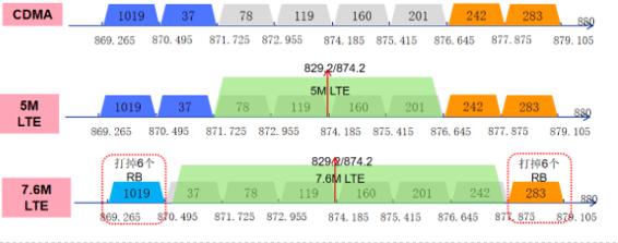 根據(jù)規(guī)劃,深耕后的LTE可以占用10M帶寬,分別打掉兩邊6個RB,頻段將由現(xiàn)在調(diào)整為870.4 MHz-878 MHz(包含帶寬),中心頻率為874.2 MHz;保留一個EVDO(283)頻率,一個1X(1019)頻率,理論速率可以由原來的35Mbps提升到50Mbps,可以作為一個分擔流量的頻點。如果兩年后VoLTE普及,退掉一個EVDO頻率,就可以基本開滿10M的800M的LTE低頻。