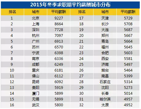 剛剛過去的2015第四季度可謂是“寒冬”,別說指望升職加薪了,不降薪已經(jīng)是萬福。下面是萬眾期待的全國32個城市平均薪酬,來一起看看吧。這次拖后腿不怪你,全國32個主要城市平均薪酬為6070元。先別慌,這只是全國平均。