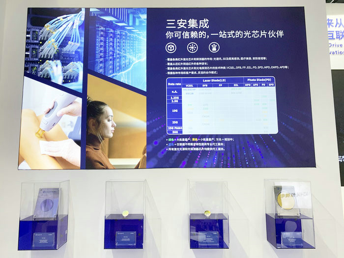 為應(yīng)對光通訊市場需求升級,三安集成通過產(chǎn)業(yè)鏈垂直整合和大規(guī)模產(chǎn)能投入,從襯底、外延、先進制程到芯片的封裝和測試,光技術(shù)事業(yè)部根據(jù)客戶需求提供全面可靈活定制的合作方式和解決方案。三安集成在展會上推出10G-25G 850nm PD 芯片,1310/1550nm MPD,SPD,PD,APD芯片,2.5G/10G/25G DFB彩光芯片,10G/25G 850nm VCSEL芯片等各類光芯片產(chǎn)品。其中,25G 850/1310nm PD已實現(xiàn)大批量量產(chǎn),25G 850nm VCSEL和25G 1310nm/CWDM DFB也已經(jīng)可以小批量量產(chǎn)。下一步產(chǎn)品規(guī)劃,例如25G PAM4、56G 850nm短距產(chǎn)品正在持續(xù)推進。