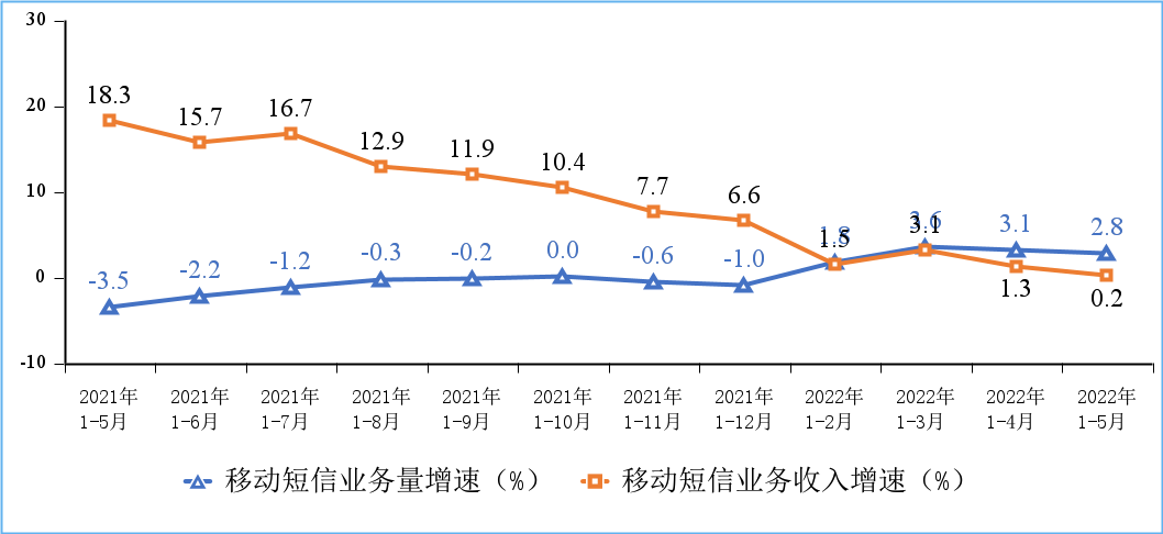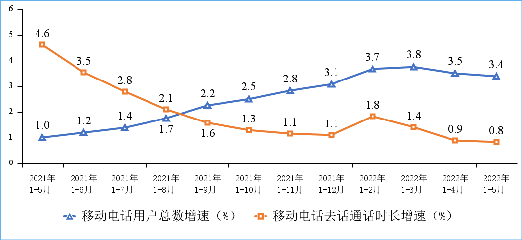 移動電話通話量小幅增長,移動短信業(yè)務(wù)收入增速持續(xù)回落。1-5月份,移動電話去話通話時長完成9278億分鐘,同比增長0.8%;固定電話主叫通話時長完成337.1億分鐘,同比下降13%。1-5月份,全國移動短信業(yè)務(wù)量同比增長2.8%;移動短信業(yè)務(wù)收入同比增長0.2%,增速較1-4月份分別回落0.3個和1.1個百分點(diǎn)。