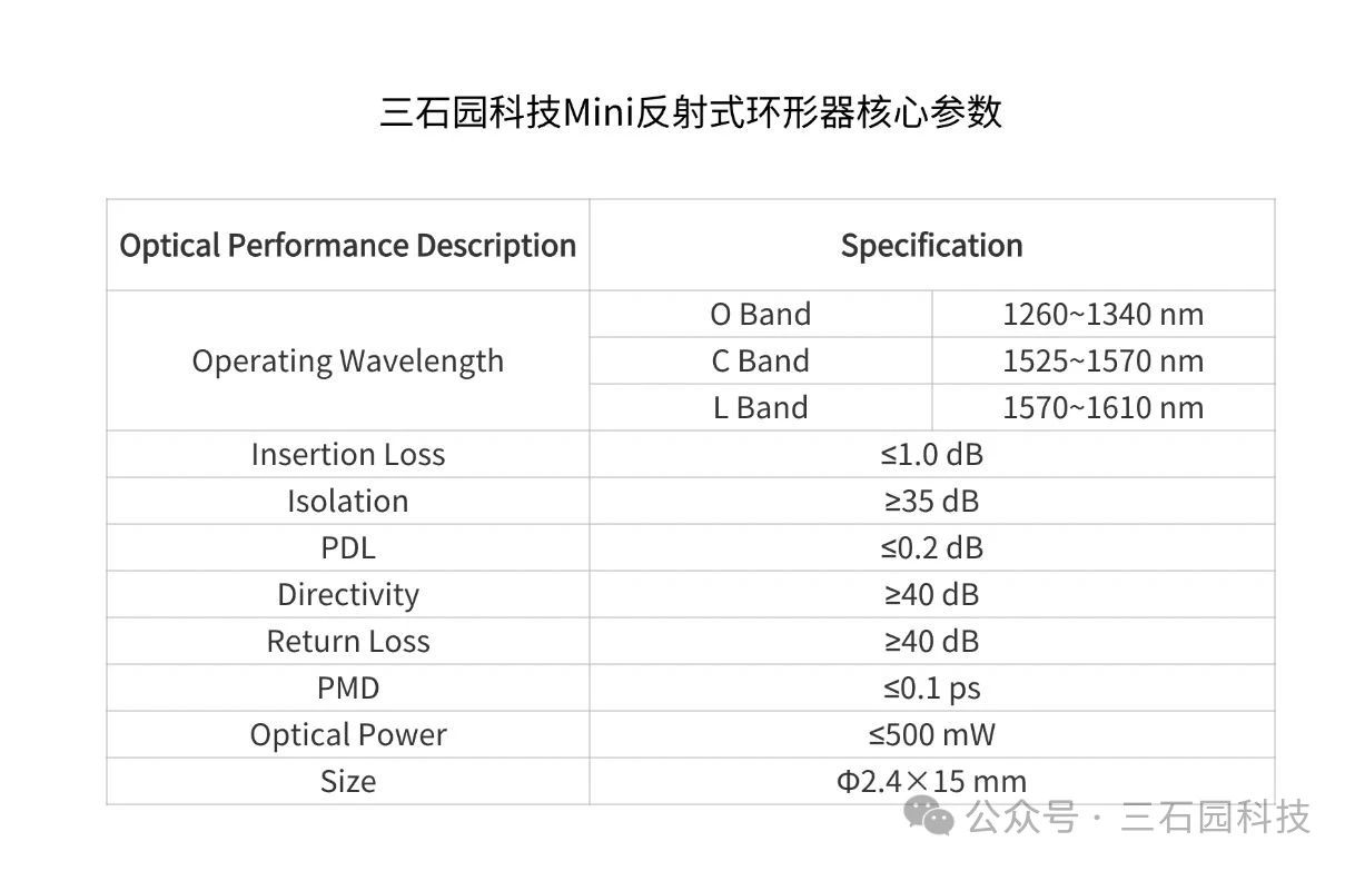 隨著通信技術的不斷發(fā)展,對元件的性能要求也在不斷提高。三石園科技Mini反射式環(huán)形器產品能提供精準、高效的信號管理解決方案。助力客戶應對復雜技術挑戰(zhàn),滿足市場對更高速、更穩(wěn)定、更小型化通信產品的需求。