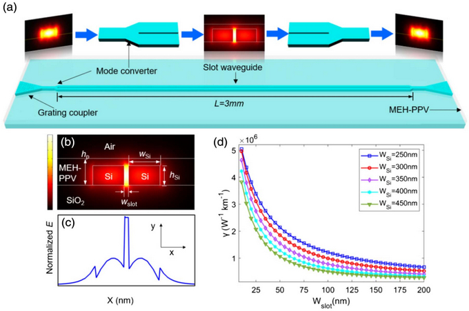 他們?cè)谡撐奶岢隽艘环N高非線性硅基聚合物狹縫波導(dǎo)(SOHSW),當(dāng)狹縫波導(dǎo)的波導(dǎo)(高折射率材料)與狹縫(低折射率材料)折射率差較大,且狹縫尺寸較小時(shí),界面處的電場(chǎng)不連續(xù)從而產(chǎn)生突變,狹縫區(qū)發(fā)生電場(chǎng)疊加,使得光場(chǎng)得到有效增強(qiáng)。同時(shí),將狹縫中填充高非線性聚合物MEH-PPV(非線性折射率n2=8.5±0.4×10?17 m2/W),進(jìn)一步增強(qiáng)器件的非線性特性。器件結(jié)構(gòu)如圖1(a)所示。