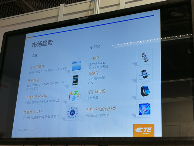 Jason指出,在數(shù)據(jù)中心連接領(lǐng)域,同樣有各種新的行業(yè)趨勢出現(xiàn),TE將之歸納為高速與小型化:“隨著企業(yè)將業(yè)務(wù)遷移到云端以及基于云的新業(yè)務(wù)不斷涌現(xiàn),要求云供應(yīng)商的設(shè)計(jì)周期更短、成本更低;在移動寬帶領(lǐng)域,到2020年5G就將上馬,網(wǎng)絡(luò)速率將達(dá)到10Gbps以上;視頻數(shù)據(jù)流與社交網(wǎng)絡(luò)推動帶寬顯著增加;物聯(lián)網(wǎng)的進(jìn)程不斷加快,下一代網(wǎng)絡(luò)中的連接設(shè)備將激增。”