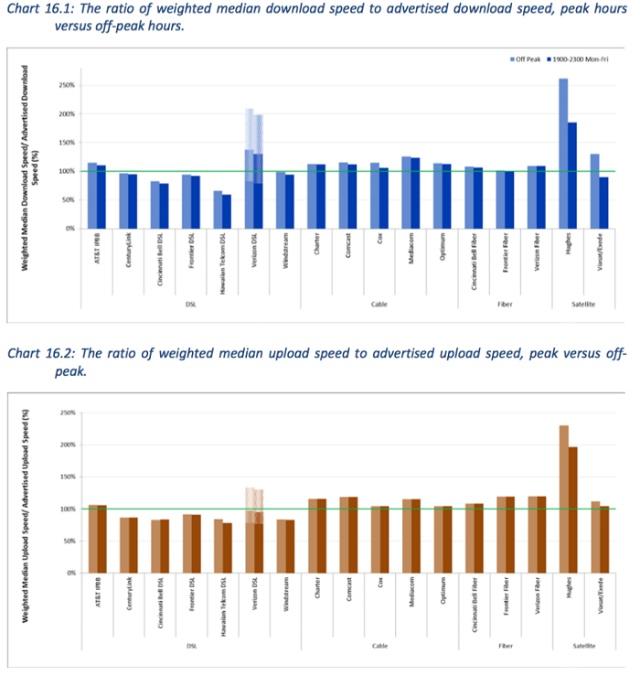 盡管有線與光纖網(wǎng)速的中位數(shù),達到了廣告宣傳的 100%;但是由 AT&T、Verizon、CenturyLink、Frontier、Windstream 等運營商提供的 DSL 網(wǎng)絡(luò)(以及衛(wèi)星接入服務(wù) ViaSat),卻遠遠地拖了后腿。