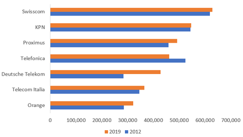 在2018年至2019年期間,所有運營商都設(shè)法使每名員工的收入增加(比如意大利電信),該公司一直在將意大利的移動客戶流失給積極進取的法國公司Iliad,該公司于2018年5月推出了低成本的意大利服務(wù)。