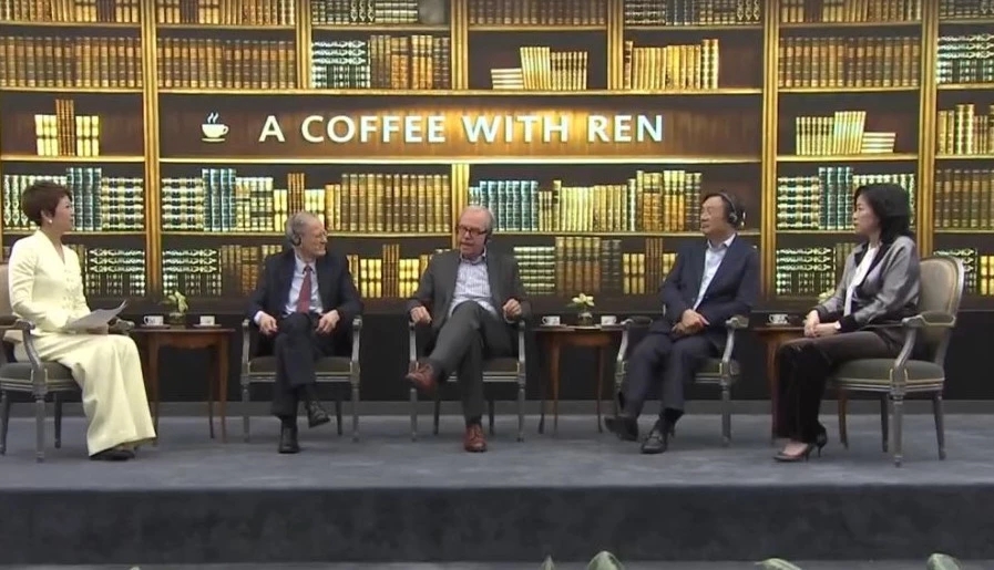 左起分別為:CGTN主持人田薇,《福布斯》著名撰稿人喬治·吉爾德,美國《連線》雜志專欄作家尼古拉斯·內(nèi)格羅蓬,華為創(chuàng)始人兼CEO任正非,華為公共及政府事務(wù)部總裁陳黎芳