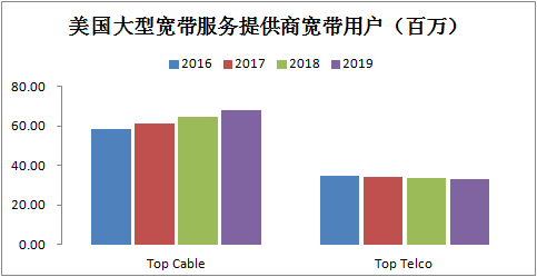 截至2019年,美國大型有線電視運營商和電信運營商的寬帶互聯(lián)網(wǎng)用戶總和達(dá)到1.012億,相比2018年底的9870萬,新增250萬。在這1.012億用戶中,大型有線電視運營商擁有6800萬,大型電信運營商擁有3320萬。