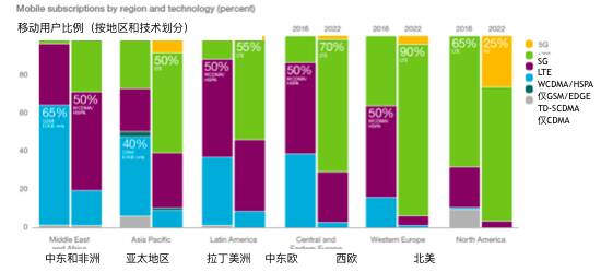 亞太地區(qū)將成為5G用戶增長速度第二快的區(qū)域,預(yù)計(jì)該地區(qū)2022年的5G用戶將占全部用戶的10%。從2016年到2022年,中東和非洲地區(qū)將實(shí)現(xiàn)重大轉(zhuǎn)變:從一個(gè)GSM / EDGE用戶占多數(shù)的地區(qū)轉(zhuǎn)變?yōu)閃CDMA / HSPA和LTE用戶占80%的地區(qū)。