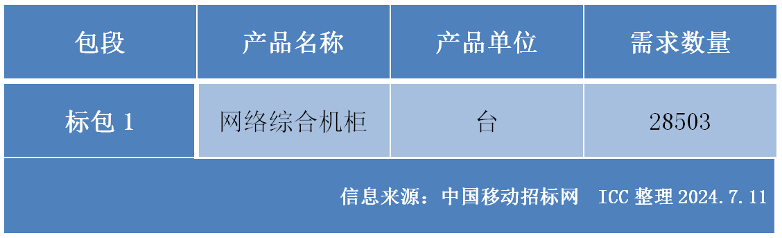 ICC訊 7月10日, 中國(guó)移動(dòng)于官網(wǎng)發(fā)布招標(biāo)公告,稱(chēng)“中國(guó)移動(dòng)2024年至2025年網(wǎng)絡(luò)綜合機(jī)柜產(chǎn)品集中采購(gòu)”項(xiàng)目,資金已落實(shí),已具備招標(biāo)條件,現(xiàn)進(jìn)行公開(kāi)招標(biāo)。