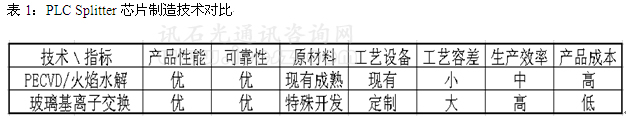 目前PLC Splitter芯片主流技術(shù)包括:PECVD技術(shù)、火焰水解技術(shù)、玻璃基離子交換技術(shù)。玻璃基離子交換技術(shù)的原理及工藝流程參見圖1、圖2所示,火焰水解技術(shù)的主要工藝流程參見圖3所示。其工藝特點對比參見表1。從行業(yè)多年的使用以及可靠性實驗來看,目前兩種技術(shù)都在大規(guī)模的生產(chǎn)使用,性能上不分伯仲。PECVD/火焰水解的特點是:設備及原材料是現(xiàn)有的材料,但是其工藝很復雜,生產(chǎn)周期較長,工藝容差小;玻璃基離子交換技術(shù)的特點是:設備及原材料需要特殊定制,但是其工藝相對簡單,生產(chǎn)效率較高,工藝容差較大,芯片成本相對較低。