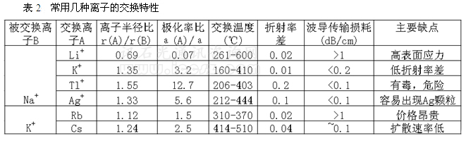 高溫下玻璃中可被交換的離子主要是堿金屬Na+、K+,而外界的交換離子主要有:Li+,K+,Rb+,Cs+,Tl+,Ag+。幾種交換離子的相關(guān)特性參見表2所示。綜合性能以及批量生產(chǎn)可操作性考慮,我們選擇Ag+—Na+交換生產(chǎn)PLC光分路器芯片,根據(jù)玻璃材料特性,可交換溫度300~400度。