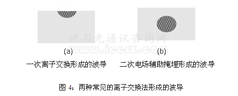 目前報道的離子交換方法有多種,主要包括:一次離子交換發(fā)、二次電場輔助掩埋法,其形成的波導截面示意圖參見圖4所示。一次離子交換主要通過純熱擴散,在玻璃表面形成光波導,其折射率變化最大值位于玻璃表面(如圖4-a),光波在玻璃表面?zhèn)鬏?。玻璃表面的缺陷使得這種波導的傳輸損耗很高。同時波導截面及光場的不對稱性使得波導的耦合損耗以及PDL嚴重。目前一次離子交換主要用于需要光場泄露到表面的傳感波導器件制作。二次電場輔助掩埋主要通過高溫下電場將交換離子從玻璃表面推到玻璃內(nèi)部。