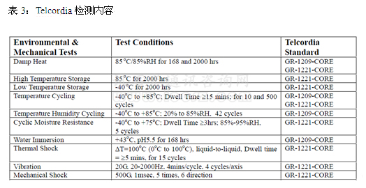 *2012年10月,按照Telcordia GR-1209-CORE和Telcordia GR-1221-CORE標準我們對裸芯片、帶耦合好光纖陣列的半成品、封入管殼的光分路器成品進行了可靠性實驗(參見表3),結(jié)果表明:芯片完全通過相關(guān)可靠性關(guān)測試要求。芯片的可靠性實驗目前還在延續(xù),截止2013年3月,經(jīng)過3000h的高溫存儲、低溫存儲、高溫高濕存儲以及2000次高低溫循環(huán)測試,芯片各項性能指標正常。