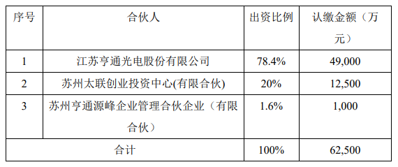 ICC訊 近日,江蘇亨通光電股份有限公司(以下簡稱“亨通光電”或“公司”)發(fā)布關(guān)于與專業(yè)投資機構(gòu)共同成立產(chǎn)業(yè)投資基金的公告稱:為促進(jìn)公司在新能源、光通信及創(chuàng)新科技與工業(yè)領(lǐng)域的發(fā)展,借助專業(yè)投資機構(gòu)的行業(yè)研究、項目管理經(jīng)驗以及風(fēng)險控制體系,增強協(xié)同效應(yīng),圍繞國家“碳中和”“東數(shù)西算”等國家戰(zhàn)略,發(fā)掘在海上風(fēng)電、光通信、儲能、人工智能、集成電路等產(chǎn)業(yè)上的優(yōu)質(zhì)標(biāo)的,推動公司的健康、可持續(xù)發(fā)展,公司擬與蘇州亨通源峰企業(yè)管理合伙企業(yè)(有限合伙)(以下簡稱“亨通源峰企業(yè)管理”)、蘇州太聯(lián)創(chuàng)業(yè)投資中心(有限合伙)(以下簡稱“蘇州太聯(lián)”)共同出資 62,500 萬元設(shè)立蘇州亨通源峰創(chuàng)業(yè)投資合伙企業(yè)(有限合伙)(暫定名,具體以工商登記核準(zhǔn)為準(zhǔn))(以下簡稱“亨通源峰創(chuàng)業(yè)投資”),亨通源峰企業(yè)管理、蘇州太聯(lián)和亨通光電分別出資人民幣 1,000 萬元、人民幣 12,500 萬元和人民幣 49,000 萬元。亨通源峰創(chuàng)業(yè)投資的基金管理人為專業(yè)投資機構(gòu)北京磐茂投資管理有限公司。