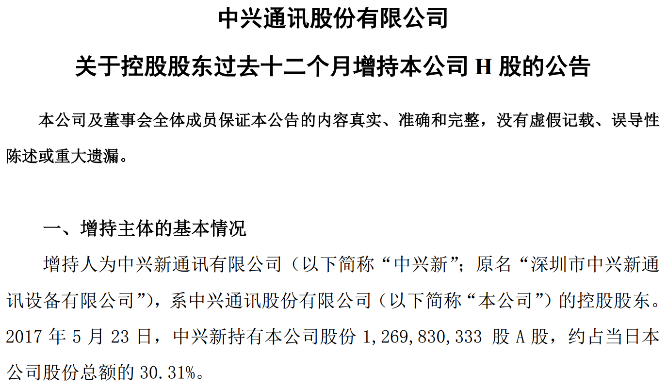 ICCSZ訊(編輯:Debi)5月23日晚間,中興通訊(證券代碼A/H:000063/763)發(fā)布關于控股股東過去十二個月增持本公司H股的公告。增持人為中興新通訊有限公司(以下簡稱“中興新”;原名“深圳市中興新通訊設備有限公司”),系中興通訊股份有限公司(以下簡稱“本公司”)的控股股東2017 年 5 月 23 日, 中興新持有本公司股份 1,269,830,333 股 A 股, 約占當日本公司股份總額的 30.31%。