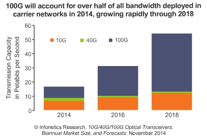 據(jù)咨詢公司RHK預(yù)計,全球超100G市場在2014-2015年啟動,2015年將可能在運營商干線網(wǎng)絡(luò)中的部分熱點區(qū)域首先部署,并且在2018年進入一個快速發(fā)展階段。