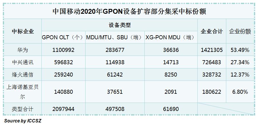 ICCSZ訊(編輯:Aiur) 近日,中國移動公布了2020年GPON設備擴容部分單一來源采購結果,設備類型包括GPON OLT、MDU/MTU、SBU和XG-PON MDU,華為、中興通訊、烽火通信、上海諾基亞貝爾分享全部份額。