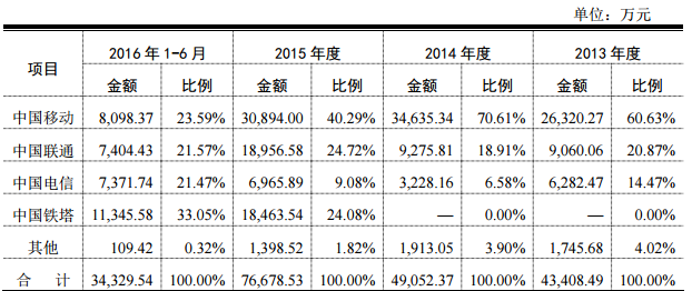 從銷售對象來看,科信技術(shù)90%以上的銷售收入來源于國內(nèi)三大通信運營商及鐵塔公司,2016年1-6月銷售對象份額分別為中移動23.59%、中聯(lián)通21.57%、中電信21.47%和中鐵塔33.05%。在中移動2016年度光分路器集采項目中,科信技術(shù)與日海通訊、天邑康和和中興新地等主要競爭對手一起上榜,科信技術(shù)獲得3.91%份額。