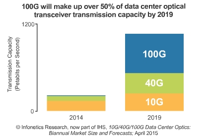 市場對100G需求增加,然而在數(shù)據(jù)中心領(lǐng)域并未得到廣泛的部署。預(yù)計到2016年100G將得到廣泛部署,由于廉價的100G硅芯片的推出和QSFP28出貨量增長的刺激。