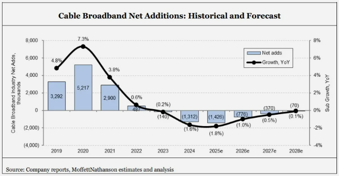 對于正處于"峰值痛苦期"的有線行業(yè),Moffett給出了相對樂觀的預(yù)測:"即使接近最壞情景,Comcast和Charter在未來五年左右也基本能保持用戶數(shù)持平,這與市場常見的末日論調(diào)相去甚遠(yuǎn)。"圖表數(shù)據(jù)顯示,美國有線運(yùn)營商寬帶用戶流失量將逐年減少,并在2028年實(shí)現(xiàn)微弱增長。這一趨勢對近期遭遇銷售歷史性下滑的有線接入設(shè)備供應(yīng)商而言尤為積極。