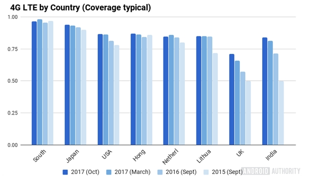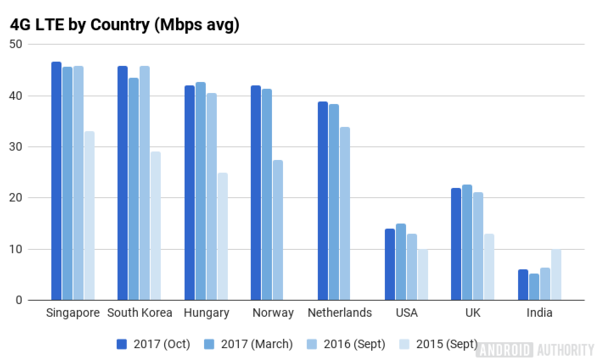 ICCSZ訊 明年的平昌冬奧會(huì),5G將首次進(jìn)行一次大規(guī)模的外場(chǎng)部署和展示。而作為“喜新厭舊”詮釋最美好的科技圈,4G也是走到頭了。據(jù)AA援引OpenSignal的最新數(shù)據(jù)報(bào)告,全球的4G平均下載速度相較去年居然出現(xiàn)了下跌。2016年9月還是17.5 Mbps,今年10月就只有16.2Mbps了。