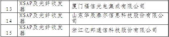 共有15家企業(yè)中標(biāo)2013年中電信MSAP及光纖收發(fā)器集采項目,分別為,安徽皖通郵電股份有限公司、北京彪騏佳訊科技有限公司、北京格林威爾科技發(fā)展有限公司、北京華環(huán)電子股份有限公司、北京康邁爾通信技術(shù)有限公司、北京明訊恒基科技發(fā)展有限責(zé)任公司、北京正有網(wǎng)絡(luò)通信技術(shù)股份有限公司、廣東九博電子科技有限公司、杭州初靈信息技術(shù)股份有限公司、江西山水光電科技有限公司、南京普天通信股份有限公司、瑞斯康達(dá)科技發(fā)展股份有限公司、廈門福信光電集成有限公司、山東華辰泰爾信息科技股份有限公司、浙江億邦通信科技股份有限公司。