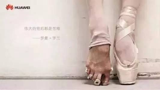 華為的全球廣告用這樣一張圖片來(lái)展示華為的奮斗精神:一位芭蕾舞演員的雙腳,一只腳上穿著優(yōu)雅的緞子舞鞋,而另一只裸露并布滿瘀傷。照片象征著成功背后的深深?yuàn)^斗。