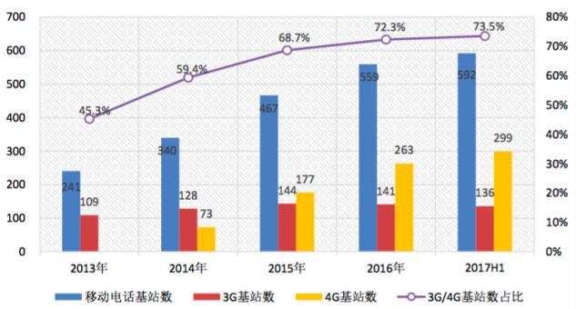 2013-2017 年移動電話基站及 3G/4G 基站占比變化情況